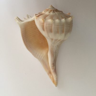 Moderately thick, left-handed shell with short, pointed spire, large body whorl, and long siphonal canal. Columella is smooth; spiral ridges in aperture. Spiral row of broad, pointed knobs occurs at shoulder of body whorl; spiral ribs on rest of shell. White, with grayish brown spiral bands and vertical streaks; aperture reddish brown with paler spiral ridges.